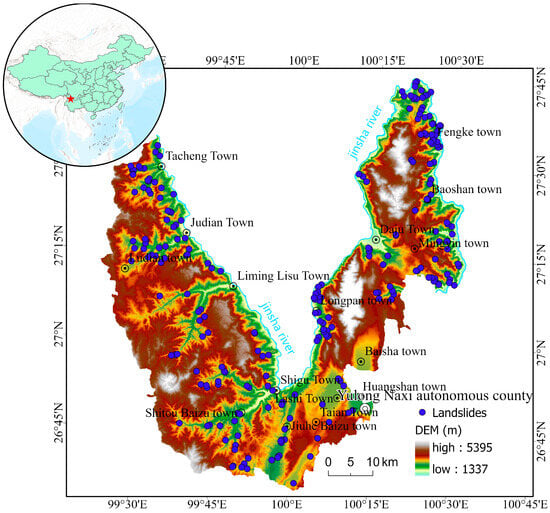 - Historical Landslide Inventory Data were obtained from the 2021 Geological Hazard Risk Survey Project (1:50,000 scale) in Yulong Naxi Autonomous County, Yunnan Province (Figure 1 blue dots);