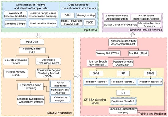 The research methodology of this study involves the following steps: (1) selecting evaluation factors and classifying attribute intervals; (2) constructing the dataset and screening evaluation index factors; (3) building the evaluation model and partitioning the model’s prediction results; (4) conducting an accuracy evaluation of the partitioned results, analyzing the distribution pattern of indices, and performing a SHAP-based interpretability analysis (Figure 2). Specifically, this study employs a contribution clustering method, using the Certainty Factor (CF) as the contribution metric to classify the continuous factor attributes. Subsequently, the Sparrow Search Algorithm (SSA) is applied for hyperparameter optimization, and the Certainty Factor is coupled with a Stacking ensemble model to construct an integrated coupling model for landslide susceptibility evaluation in Yulong County. Finally, the model’s applicability is assessed, and an interpretability analysis is performed based on the prediction results.