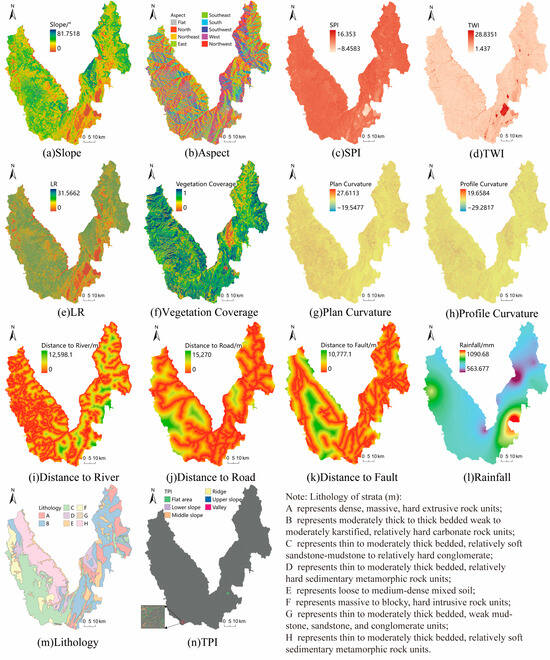 Based on previous research experience, 11 continuous evaluation factors have been preliminarily selected, including the slope, planar curvature, profile curvature, topographic wetness index (TWI), stream power index (SPI), distance to river, distance to roads, distance to fault, vegetation coverage, slope length steepness factor (LR), and annual average precipitation, along with 3 discrete evaluation factors, the aspect, topographic position index (TPI), and lithology, totaling 14 evaluation factors (Figure 3) [,].