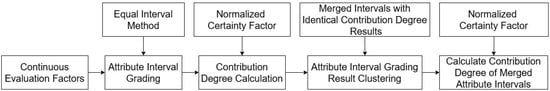 In contrast to the approach proposed by Ke et al. (2023), which involves interval grading of factor attributes using equidistant intervals determined by expert judgment and applies the frequency ratio as a contribution index in contribution-based clustering, this study divides all factors into 20 discrete attribute intervals using an equal interval method []. Subsequently, the normalized Certainty Factor for each attribute interval is calculated as the contribution index, with the contribution degree being precise to six decimal places. The grading is further refined by clustering and merging equal indices, after which the contribution degrees for the merged attribute intervals are recalculated. The final results provide the data foundation for constructing the sensitivity evaluation index system (Figure 4). Discrete evaluation factors are graded according to their inherent natural attributes. Some results of grading for both continuous and discrete factors are shown in Table 1.
