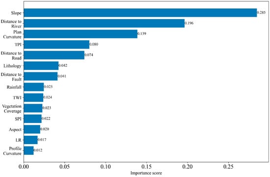 Only factors with an importance score greater than 0.01 were included in the model training, while those with an importance score lower than 0.01 were considered redundant and removed. As shown in Figure 5, among the 12 evaluation factors, slope has the highest importance, making it the most significant controlling factor for landslides in Yulong County. In contrast, profile curvature has the lowest importance score of 0.012, indicating it has the least influence on landslides in the study area. However, since its importance score is above the 0.01 threshold, it was not removed in the importance analysis [].