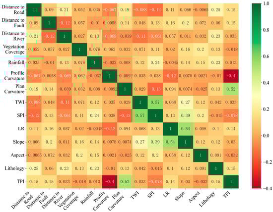 A correlation analysis can identify factors that provide similar information through the strength of correlations between pairs of factors, allowing for the selection of less correlated factors for classification and predictive modeling. According to the widely accepted Pearson correlation coefficient classification standards proposed by Cohen, factors with a correlation of less than 0.3 are considered to have a weak correlation, those with correlations between 0.3 and 0.5 are considered to have a moderate correlation, and factors with correlations greater than 0.5 are considered to have a strong correlation []. Therefore, this study selects factors with a correlation less than 0.3 as the most representative factors for classification and predictive modeling. Pearson correlation coefficients were calculated for each evaluation factor, resulting in the Pearson correlation coefficient chart (Figure 6) []. As shown in Figure 6, TPI has correlations of −0.4 with planar curvature and 0.52 with profile curvature, LR has a correlation of 0.54 with slope, and SPI has correlations of 0.56 with TWI and 0.39 with slope. Consequently, the relatively less commonly used factors TPI, LR, and SPI are excluded from the combinations of factors with correlations greater than 0.3.