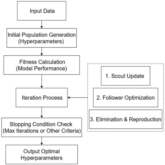 The main principle involves assigning roles of discoverers, joiners, and scouters in the hyperparameter search space, with individuals within the swarm switching among these roles to search for the optimal settings. Discoverers are responsible for the global search to find positions with better fitness (better-performing hyperparameter combinations), and joiners perform local searches to refine the solutions in these positions. By dynamically adjusting the number of discoverers and joiners, SSA balances exploration and exploitation, preventing the algorithm from getting trapped in local optima while improving solution accuracy. SSA also includes a danger avoidance mechanism: if scouters detect areas with poor fitness values, all roles rapidly relocate to better areas, continuing the search for optimal hyperparameters. This mechanism effectively enhances the algorithm’s robustness and convergence capabilities (Figure 7).