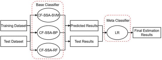 In this study, we selected three different coupled models—CF-SSA-SVM, CF-SSA-BPNN, and CF-SSA-RF—as the base classifiers. The rationale behind choosing SVM, BPNN, and RF models for coupling as base models lies in their well-established performance in classification tasks and their complementary strengths, which can enhance the model’s overall performance and robustness []. Other models, such as decision trees or K-Nearest Neighbors, were not chosen due to their tendencies towards overfitting or scalability issues in the context of large datasets, which might have negatively impacted the ensemble’s predictive accuracy []. A Logistic Regression model (LR) was employed as the meta-classifier to construct a two-layer ensemble coupled learning model (Figure 8).