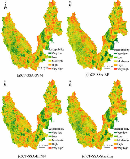 The susceptibility mapping method primarily categorizes susceptibility levels based on either geometric interval proportions or grid area proportions [,]. Building upon previous research, this study divides the predicted results of four coupled models (CF-SSA-SVM, CF-SSA-BPNN, CF-SSA-RF, and CF-SSA-Stacking) according to their respective grid area proportions, ranging from highest to lowest, into five levels: very high susceptibility (10%), high susceptibility (20%), moderate susceptibility (40%), low susceptibility (20%), and very low susceptibility (10%). This approach is used to generate a landslide susceptibility zoning map [].