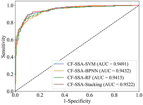 Moreover, the optimized CF-SSA-Stacking coupled ensemble model outperformed the CF-SSA-SVM, CF-SSA-BPNN, and CF-SSA-RF base coupled models across multiple performance metrics. Specifically, the CF-SSA-Stacking model exhibited improvements of approximately 2.3%, 2.1%, 4.6%, and 1.1% in the accuracy, F1 score, Kappa coefficient, and AUC, respectively. This indicates that the Stacking model significantly enhances overall performance by integrating the strengths of multiple base models.