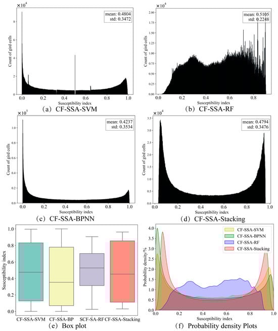 (a–d) Susceptibility index distribution maps; (e) box plot; (f) Probability density plots.