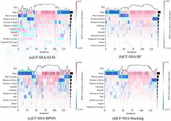 Figure 12 presents the SHAP heatmaps of four coupled models: CF-SSA-SVM, CF-SSA-BPNN, CF-SSA-RF, and CF-SSA-Stacking. The left y-axis shows the feature importance rankings determined by SHAP values, ordered from highest to lowest contributions. The right side provides the visual representation of these rankings. Each column represents an instance from the test set, where the color intensity indicates the absolute magnitude of the SHAP values—the darker the color, the more significant the feature’s impact on the model’s prediction. The top part visualizes the models’ prediction results under different feature values []. From Figure 12, it can be observed that all four models rank the top four features—the slope, planar curvature, distance to river, and distance to road—consistently. This consistency indicates that these models effectively identify key features closely related to geological processes in landslide prediction. Specifically, the slope, as a topographic variable, is a core feature for the models due to its direct influence on landslide occurrences. Additionally, features like the planar curvature, distance to river, and distance to road further assist the models in understanding the terrain and hydrological conditions, thereby enhancing their capability to assess landslide risk. However, beyond these key features, the importance rankings of other features vary between models. This suggests that while the models exhibit consistency in identifying the major risk factors, differences in model structure and learning mechanisms lead to discrepancies in how they evaluate the contribution of secondary features. These variations reflect the models’ distinct preferences in feature selection and sensitivity, highlighting the significant influence of model architecture on feature extraction.