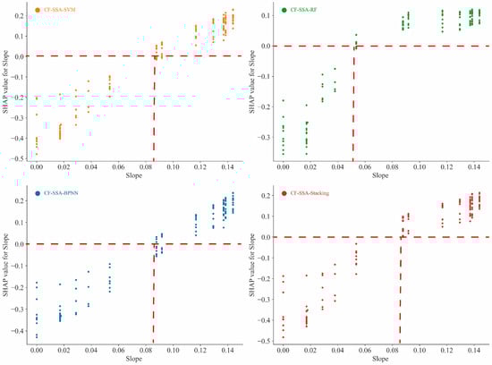 Figure 13 presents the SHAP dependence plot for the slope feature, illustrating its contribution to the model’s output. The x-axis represents the normalized Certainty Factor value, which was previously calculated and reflects the certainty of landslide occurrence, while the y-axis indicates the influence of the slope feature on the model’s landslide susceptibility prediction (y values greater than 0 indicate a positive contribution, while y values less than 0 indicate a negative contribution) []. From Figure 13, it can be observed that the contribution trends of the slope feature are similar across all four models, with most of the positively contributing sample points concentrated in the region where the normalized Certainty Factor is greater than 0.08. Based on the analysis of Table 1, the slope range of 8.3–36.8° aligns closely with the slope range of landslide-prone areas (10–45°) reported in the literature []. This indicates that the model effectively captures the relevant geological characteristics when predicting landslide risks. Notably, the Stacking model, despite its more complex structure, continues to produce results that are consistent with geological principles. This demonstrates that the model’s complexity does not compromise its reasonable assessment of the slope feature. Therefore, it can be further concluded that the model exhibits strong interpretability and robustness in predicting landslide risk.