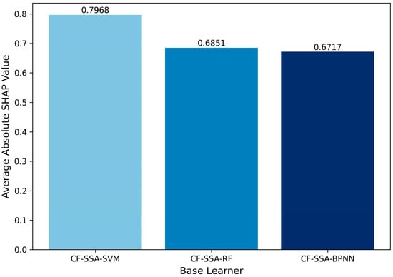 Figure 14 illustrates the marginal contributions of each base model to the ensemble model (Stacking), calculated through the SHAP analysis using the mean absolute SHAP values []. As shown in Figure 14, CF-SSA-SVM has the highest mean absolute SHAP value (0.7968), indicating that it plays the most critical role in the Stacking model and contributes significantly to the final prediction outcome. In comparison, CF-SSA-RF and CF-SSA-BPNN contribute less, with SHAP values of 0.6851 and 0.6717, respectively, but they still play an important role in capturing different patterns and features within the data. The differences in marginal contributions among the base models suggest that they effectively complement each other in the Stacking structure, compensating for the weaknesses of the other models and significantly enhancing the overall model performance. Although CF-SSA-SVM has the highest marginal contribution, CF-SSA-RF and CF-SSA-BPNN also contribute to improving the model’s robustness and generalization capability. This further demonstrates that, despite the complexity of the ensemble model, the complementary nature of the base models enhances the overall predictive performance and generalizability of the model.