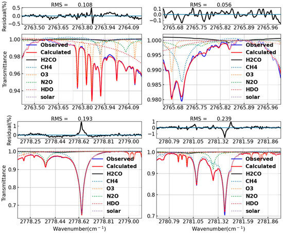 The retrieval strategy determines the accuracy of the solar absorption spectrum retrieval results. Trace gases have different absorption characteristics in different spectral bands. The selected spectral window for retrieval should not only avoid the saturation of strong absorption lines but also avoid the signal of weak absorption lines being submerged by noise, so as to minimize the interference of other gases and solar spectral lines. A prior profile information and interference gas composition have an important influence on spectral retrieval. The spectral retrieval parameters of atmospheric CO, H2CO, and HCN are set as shown in Table 1. There are three retrieval windows for CO and HCN, and four for H2CO. The spectroscopic signatures of the interfering gases were accounted for to minimize fitting residuals. H2O and HDO are treated as distinct interfering species during retrieval, with line parameters sourced from the HITRAN 2008 database. The daily atmospheric temperature, pressure, and humidity a priori profiles are interpolated using reanalysis data from the National Centers for Environmental Prediction (NCEP) [39]. A priori profile data from version 6 of the Whole Atmosphere Community Climate Model (WACCAM) are used for CO, H2CO, HCN, and other interfering gases except H2O and HDO. The ground meteorological data are recorded by the weather station. The atmosphere is divided into 48 discrete layers from the surface to 120 km for model calculation [35,40,41].