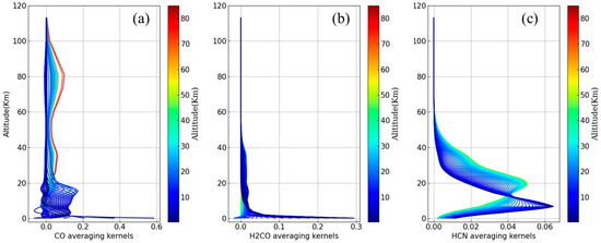 The averaging kernels of (a) CO, (b) H2CO, and (c) HCN.