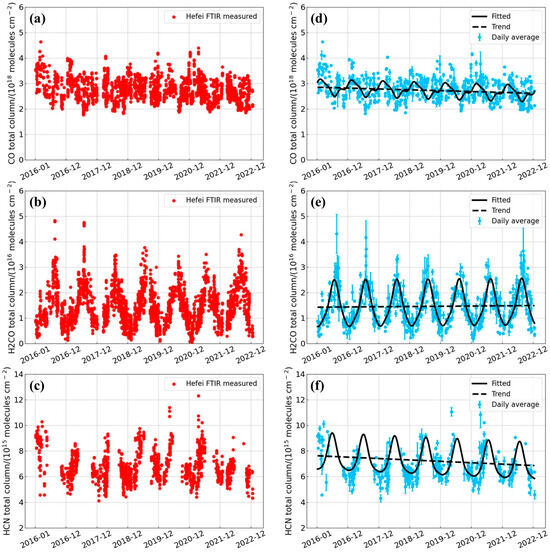 The time series of total columns for (a) CO, (b) H2CO, and (c) HCN measured by FTIR at the Hefei site. The time series of daily averages for (d) CO, (e) H2CO, and (f) HCN. The black solid line depicts the fitting curve, while the black dashed line indicates the annual trend. The red dots represent individual measurements, the light blue dots indicate the daily average, and the blue error bars show the standard deviations of the daily average.