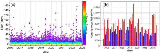 Fires emit heat energy, which spreads through radiation, conduction, and convection. Fire radiative energy (FRE), similar to electromagnetic radiation, travels through space and is detectable from aircraft and satellites [49]. Retrieving fire radiative power (FRP) provides new avenues for studying emissions from biomass burning and their impact on air quality [50,51]. For each fire pixel detected by satellite, the corresponding FRP (or FRE) can be obtained. FRP represents the pixel-integrated fire radiative power in megawatts (MW). The Fire Information for Resource Management System (FIRMS) archives FRP data, which is generated from the Visible Infrared Imaging Radiometer Suite (VIIRS) by NASA (https://firms.modaps.eosdis.nasa.gov/download/, accessed on 2 April 2024). Figure 10 shows the FRP values measured by satellite in Anhui province from 2016 to 2022. The total FRP values in each month are calculated, shown in Figure 10b, and the months with the total FRP greater than the monthly average within each year are marked with red.