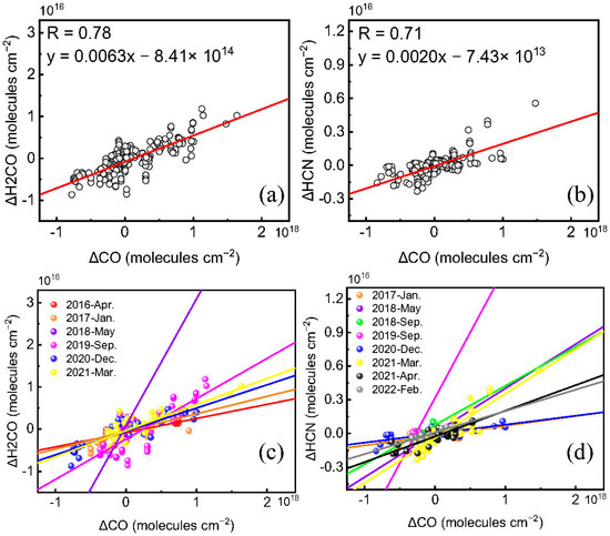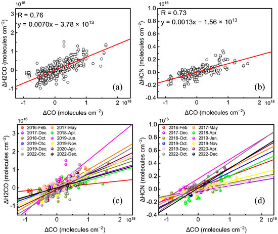 Similar to Figure 11, but for the months in the second category with correlation R values between ΔH2CO and ΔHCN with ΔCO greater than 0.6. (a) ΔH2CO versus ΔCO and (b) ΔHCN versus ΔCO for all the months when H2CO or CO are affected by long-distance biomass burning sources (black). Correlation plots of (c) ΔH2CO versus ΔCO and (d) ΔHCN versus ΔCO for each month when H2CO and CO are predominantly affected by H2CO or CO are affected by long-distance biomass burning sources. The data in different months are represented by color points. All solid lines are linear fits.