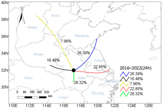 The 24-h backward trajectories can be divided into five categories. The largest proportion of 26.39% was from the sea and passed through the northern part of Jiangsu province. In addition, 26.32% of air masses came from the southern part of Anhui province and 22.85% came from the eastern part of Jiangsu province and traveled through the southern part of Jiangsu province. Also, 16.48% of air masses came from the southern part of Henan province. Finally, the remaining 7.96% was from the Shanxi province and passed through the southern part of Hebei province, Henan province, and the northwest part of Anhui province. So, within 24 h, about 49.24% of air masses passed through Jiangsu province, and 26.32% came from the southern part of Anhui province. It means Jiangsu province, the eastern part, and the southern part of Anhui province had a great impact on the variations of pollutants over the Hefei site.