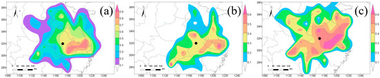 PSCF for (a) CO, (b) H2CO, and (c) HCN over 24 h during which the monthly correlation R of CO and H2CO with HCN is greater than 0.8 from 2016 to 2022 at the Hefei site. The black dot represents the location of the Hefei site.