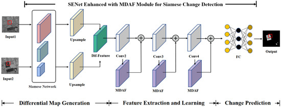The overall network structure for change detection, referred to as MDAF-Net, is illustrated in Figure 1. The input consists of bi-temporal SAR [46] images, denoted as Input1 and Input2, and the final output is the change detection result, Output. The framework is composed of three main components: