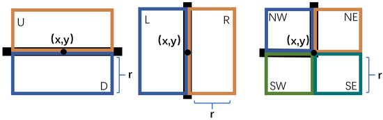 To effectively denoise and enhance edge features in the input feature map, the MDAF module employs a approach utilizing eight directional windows, as shown in Figure 3. The proposed directional windows for denoising, , represent eight directions: left, right, up, down, northwest, northeast, southwest, and southeast. The first four directions primarily match vertical and horizontal lines, while the latter four align with diagonal edges. Here, x and y are the coordinates of the central feature point, and r is the radius of the window size. By altering r while fixing , the size, direction, and position of the window can be adjusted. Once the center coordinates are fixed, applying a filter kernel, F, within each directional window produces eight outputs: