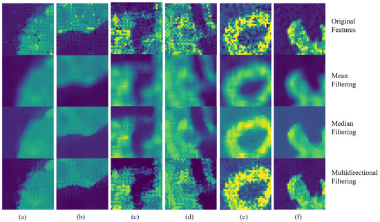 Feature layer visualization using various filtering methods. Each group (a–f) shows original features, mean filtering, median filtering, and multidirectional filtering results.