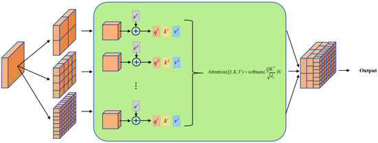 The denoised and enhanced feature layers primarily contain local information, which is not conducive to learning global semantic information. By passing these features through the multiscale self-attention (MSSA) module, both global and local information are integrated [54], as shown in Figure 5. In the MSSA module, the input feature layer has dimensions of 16 × 16 × 10. Initially, the original feature layer is divided into blocks. To facilitate multiscale learning of global information, the model processes three parallel block partitioning modes: four 8 × 8 × 10 blocks, sixteen 4 × 4 × 10 blocks, and sixty-four 2 × 2 × 10 blocks. For each self-attention operation, the input features are first flattened, treating each block as a token. This process disrupts the inherent positional information of the features, so positional encoding is added to each token based on its original sequence attributes. This positional encoding helps determine the location of neighboring blocks and their distances relative to the current block.