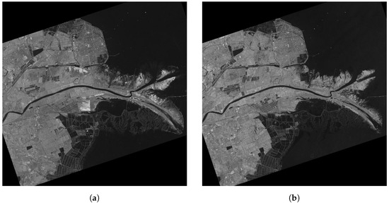 Dual-temporal SAR images of Yellow River estuary dataset. (a) Taken on 18 June 2008, (b) Taken on 19 June 2009.