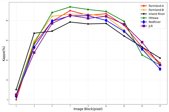 In this model, the performance of both the MDAF module and the MSSA module is influenced by a key parameter: the input image patch size. This parameter significantly affects the overall performance of the model. In this experiment, we analyze the impact of different image patch sizes, specifically 1, 3, 5, 7, 9, 11, 13, 15, and 17. The Kappa metric for the Farmland-A, Farmland-B, Inland River, Ottawa, Red River, and JRL datasets is analyzed, with the results shown in Figure 8.