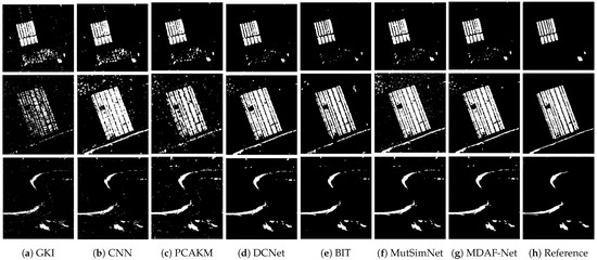 By comparing MDAF-Net with these methods, we aim to demonstrate the superiority of our approach in terms of change detection accuracy. The change detection experiments were conducted on the typical regions of the Yellow River estuary, namely Farmland-A, Farmland-B, and Inland River. The performance of the aforementioned algorithms was compared with the proposed MDAF-Net. The detailed comparison of prediction results is presented in Table 2, and the visualized prediction results are shown in Figure 9a–f.