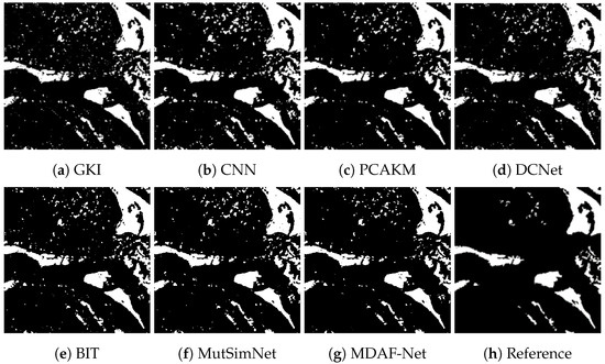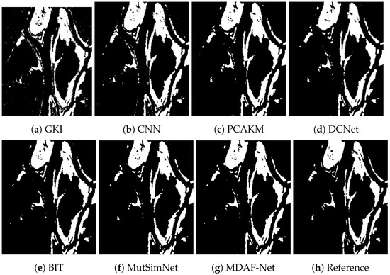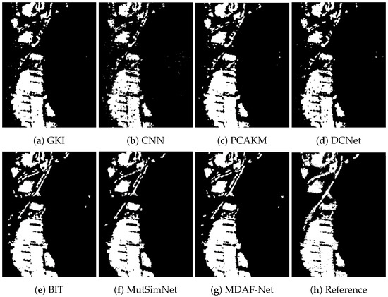 We conducted change detection experiments on the Red River dataset, comparing the performance of the aforementioned algorithms with the proposed MDAF-Net. The predicted results are shown in Figure 11a–f, and the comparative analysis of specific prediction metrics is presented in Table 4. From the change detection results shown in Figure 11, we observe a significant number of misclassified spots in the upper part of the image, indicating a complex region. Both GKI and the CNN display numerous noise blocks, largely due to the abnormal noise in the original features. While PCAKM and DCNet show a slight reduction in noise, they struggle with identifying the change characteristics in the riverbank sandbars. Both the BIT and MutSimNet algorithms underperform in handling noise. In contrast, the proposed MDAF-Net model excels in learning features in dispersed regions, accurately excluding false detection areas and achieving superior detection performance. As reflected in Table 4, the Kappa index of MDAF-Net surpasses the other methods by at least 2.17%.