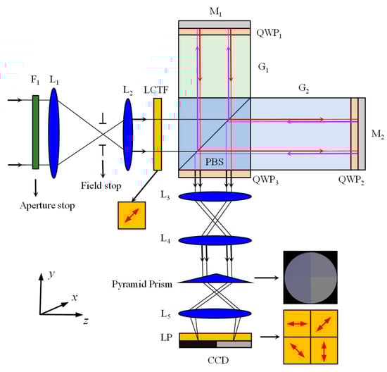 The optical layout of the LCTF-MPWIMI system is illustrated in Figure 1, showcasing a compact optical arrangement. The filter F1, in conjunction with the LCTF, is employed to isolate the target airglow spectral lines at wavelengths of 557.7 nm and 630.0 nm, with F1 positioned at the aperture stop. Lenses L1 and L2 form a pre-telescope system with a magnification factor greater than one, designed to collect a larger amount of optical energy and to scale the aperture of the incident beam for compatibility with the polarization interferometer. The field stop is located at the rear focal plane of L1, serving to confine the imaging range of the optical system. The Polarization Wind Imaging Michelson Interferometer comprises the following components: LCTF, polarizing beam splitter (PBS), arm glasses G1 and G2, three quarter-wave plates (QWP1, QWP2, QWP3), reflecting mirrors M1 and M2, and a linear polarizing array (LP) positioned in close proximity to the CCD. The primary function of the interferometer module is to generate four interferograms, each encoding information about the atmospheric wind speed and temperature, with different phase steps. Lenses L3 and L4 form a post-telescope system, intended to output parallel light and match the pupil on the pyramid prism. The pyramid prism, in conjunction with the imaging lens L5, accomplishes a fourfold division of the interferogram in the parallel optical layout, known as aperture division. This divided light, after passing through the LP, is ultimately imaged onto the CCD.