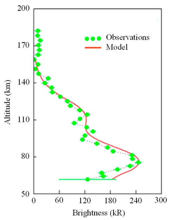 The limb profiles of [Oi] 557.7 nm dayglow intensity observed with UVIS on 28 April 2019 (green dots) [10].