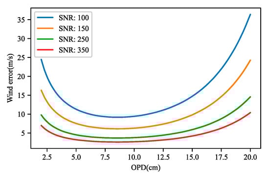 The field-widened interferometer used for measuring the wind and temperature fields in the Martian middle and upper atmosphere has the advantage of high throughput and a large OPD, allowing the small Doppler frequency shifts caused by wind speeds to be converted into detectable phase shifts by the interferometer. The OPD of the field-widened interferometer is closely related to the measurement uncertainties of wind speed can be expressed as [15,16]