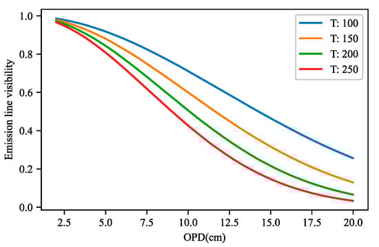 Based on Equations (6) and (12), the curves of wind speed measurement uncertainty and spectral line visibility as functions of OPD were plotted, as shown in Figure 4 and Figure 5, respectively. From Figure 4, it can be seen that as OPD increases, the wind speed measurement uncertainty first decreases and then increases; the larger the SNR, the smaller the wind speed measurement uncertainty. From Figure 5, it can be seen that as OPD increases, the spectral line visibility gradually decreases; the higher the temperature, the smaller the spectral line visibility. To ensure a wind speed measurement uncertainty of 5 m/s and to prevent the spectral line visibility from being too low to detect, while also considering the volume and weight of the instrument, we chose 7.5 cm as the OPD for the LCTF-MPWIMI.