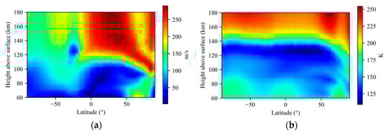Typical wind speed and temperature data from the Mars climate database [19]: (a) typical Martian atmospheric wind speed map; (b) typical Martian atmospheric temperature map.