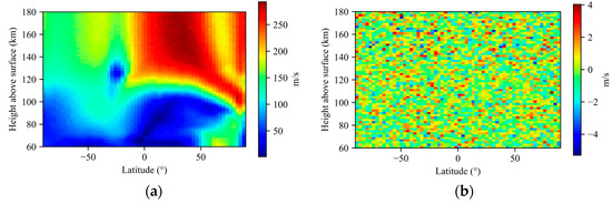 Retrieval of Martian atmospheric wind speed using 557.7 nm interferograms: (a) retrieved wind speed map; (b) wind speed error map.