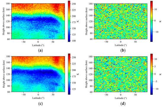 Retrieval of Martian atmospheric temperature using two spectral lines: (a) retrieved temperature map from single spectral line; (b) single spectral line temperature error map; (c) retrieved temperature map from dual-spectral line; (d) dual-spectral line temperature error map.
