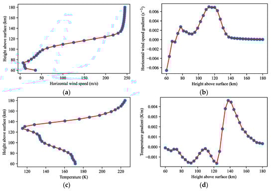 Typical wind speed and temperature profiles from the Mars Climate Database [19], along with their gradients with respect to height, at a solar longitude of Ls = 250°, local time of 12:00, and a Martian longitude and latitude of 0°: (a) horizontal wind speed profile; (b) calculated horizontal wind speed gradient; (c) temperature profile; (d) calculated temperature gradient.