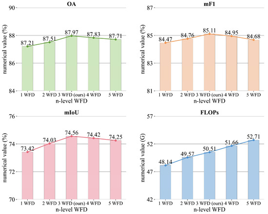 The trends of the evaluation metrics for different levels of WFD in MWFD are illustrated in Figure 6. From the top left to the bottom right, the graphs represent OA, mF1, mIoU, and FLOPs, respectively. The metrics significantly improve with 1–3 levels of WFD, but begin to decrease slightly as the number of WFDs continue to increase. Since each WFD halves the scale of the feature map, when the number increases, the feature map scale is too small and the segmentation effect decreases. However, as the WFD increases, the FLOPs gradually increase. Therefore, three levels of WFD is the best solution to balance the performance and computational overhead.