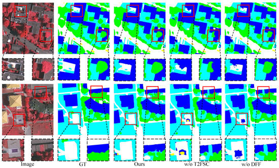 The quantitative results without T2FSC on the Vaihingen and Potsdam datasets are presented in Table 3. After removing T2FSC, the OA, mF1, and mIoU of our method decreased by 1.27% (1.41%), 1.02% (1.30%), and 2.13% (2.53%), respectively. The visualization results after removing T2FSC are shown in Figure 7. It can be clearly observed in the enlarged areas that the phenomenon of category stacking seriously affects the segmentation results after removing T2FSC, and the category boundaries become rough. This indicates that T2FSC achieves more accurate constraints on spatial features, especially boundary features, so that the network can segment the category boundaries more accurately. In the second visualization scenario, after removing T2FSC, the inside of the impervious surface is incorrectly segmented into building and car. This indicates that T2FSC mitigates the segmentation instability caused by intra-class variations.