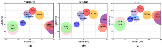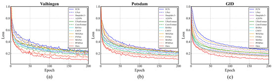 The comprehensive evaluation of the mIoU and computational overhead of the various methods in the Potsdam dataset is shown in Figure 9b. It can be clearly seen that our methods achieve the highest mIoU with an excellent balance between performance and computational overhead. Figure 10b represents the loss curves of each method when trained on the Potsdam dataset. Our method also maintains the fastest convergence rate, and the loss decreases smoothly during training, ultimately achieving the best convergence results.