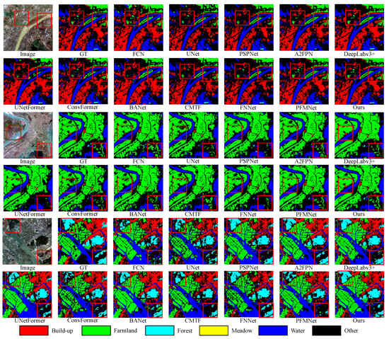 For a comprehensive comparative analysis, we selected 13 methods from classical to state-of-the-art: FCN [27], UNet [12], PSPNet [29], A2FPN [33], Deeplabv3+ [30], MANet [28], ConvFormer [42], BANet [43], UNetFormer [44], CMTF [45], WFENet [54], FNNet [63], and PFMNet [65]. In particular, FCN [27], UNet [12], PSPNet [29], A2FPN [33], Deeplabv3+ [30], and MANet [28] are CNN-based methods; ConvFormer [42], BANet [43], UNetFormerr [44], and CMTF [45] are Transformer-based methods; WFENet [54] is based on wavelet transform; and FNNet [63] and PFMNet [65] are fuzzy-based methods.