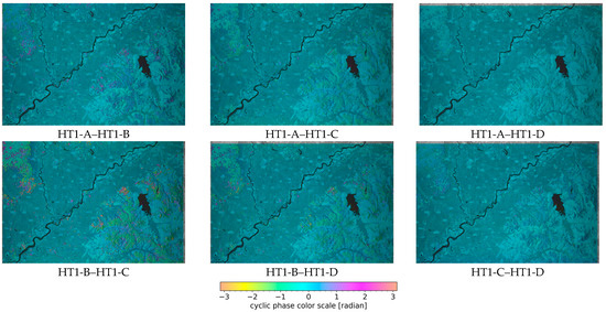 In the calculation of the orbital and topographic phases, and also later on in the interpretation of the differential interferometric phases, the bistatic nature of the pairs is considered. The two-way slant range of the pair HT1-A–HT1-B, for example, corresponds to the sum of the one-way slant range of HT1-A plus the one-way slant range of HT1-B. The resulting differential interferograms have high coherence. They all show small overall phase trends that may be related to the exact geometry of the constellation, orbit movements, the geometric and phase models used in the bistatic SAR data focusing and the geometric model used in the simulation of the topographic and orbital phases. Forests and water areas were masked in the estimation of this overall low-frequency phase term. The forest areas were not considered, as the phase clearly deviates from the low-frequency residual orbital phase. Over the water, the phase is noisy and therefore not reliable. The remaining phase was filtered, unwrapped and spatially interpolated. This low-frequency residual orbital phase was then subtracted from the differential interferogram to obtain the “detrended” differential interferogram. For clarity, the intermediate results of this detrending process are shown for one of the pairs in Figure 2. The six detrended differential interferograms are shown in Figure 3.