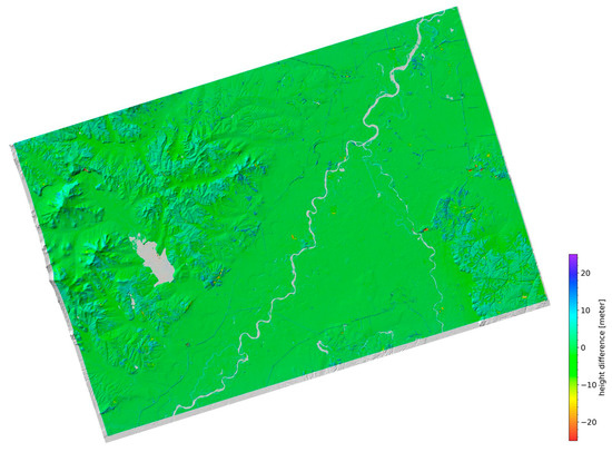 The determined height corrections are shown in Figure 5. Positive values indicate that the height estimated with the HT1 data of 5 September 2023 is higher than the 1” Copernicus DEM height. Both positive and negative height corrections are observed. No height correction was estimated for water areas and radar shadow, where the signal noise dominates. In the updating of the DEM, the height of the pre-existing DEM was used for these areas.