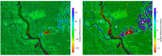 Figure 6. A 4.2 km × 3.3 km section of height corrections relative to 1” Copernicus DEM heights, derived from multi-static HT1 acquisition. The image brightness corresponds to the radar backscatter. Different color scales are used in the two visualizations. With the finer color scale used in the image to the right, small, meter-scale corrections become visible. The letters A to D indicate areas with different types of height changes (A: mining area; B: forest area; C: agricultural field; D: trees/hedges along a road) further discussed in the text.