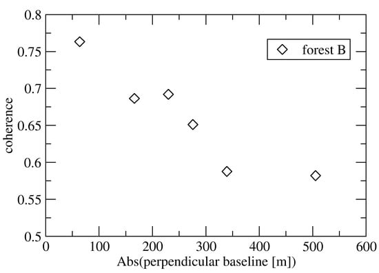 In addition to the interferometric phase, the coherence is also of interest. It characterizes the phase noise and is therefore useful, e.g., in phase unwrapping. But beyond this, the coherence relates to the characteristics of the target. Figure 8 shows the multi-static coherence for three pairs with short to long baselines. For much of the area, the coherence is high as there is no temporal decorrelation. However, we clearly observe reduced coherence levels over forests—this in spite of the simultaneous acquisition of the set of multi-static SLCs. The reason for the reduced coherence is volume decorrelation [46]. With an increasing baseline, the average coherence level over a given forest stand decreases (Figure 9). This behavior is well known and can be used to estimate forest parameters such as the forest stand height or biomass. Simultaneously obtaining multiple single-pass coherence images with different spatial baselines is very attractive for these applications as it permits us to prevent confusing baseline-related effects with effects caused by temporal changes in the targets, such as seasonal changes, leaf-on leaf-off effects and vegetation growth.