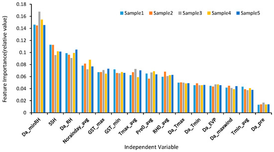 According to the principle of minimum OOB error, variable importance graphs were obtained for the five subsets. The research applied RF and XGB models, incorporating a minimum of three significant variables identified from the five intermediate models, to analyze the full dataset comprehensively. Figure 2 illustrates the paramount meteorological variables within the final model, arranged in descending importance, encompassing a total of 15 factors. According to Figure 2, the impact of daily meteorological factors on fire occurrence is greater than that of average climate factors during the fire season. Based on the results of the feature selection algorithm, only the top nine variables with the highest average importance (with importance exceeding 5%) were selected to participate in the modeling using the RF algorithm. These variables include minimum daily relative humidity, sunshine hours, daily average relative humidity, fire-prevention period without precipitation days, daily average land surface maximum and minimum temperatures, fire-prevention period average maximum temperature, precipitation, and relative humidity. These variables are consistent with the important meteorological factors identified in the LR experiments. From the figures, it is evident that variables such as Da_minRH, SSH, and Da_RH significantly affect the drying of vegetation and the ground, thereby increasing fire risk. GST_max and Tmax_avg further exacerbate fire occurrence by accelerating moisture evaporation. The importance of meteorological factors lies in their direct influence on moisture content in vegetation and the ground [76]. Although variables such as the number of days without rainfall and maximum temperature rank lower, they are crucial in prolonging dry conditions and increasing fire persistence [15].