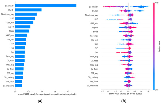 The SHAP summary plot ranks the top 20 variables affecting model predictions by their mean absolute SHAP values, shown on the y-axis. Subfigure (a) showcases the importance of these features, while subfigure (b) illustrates their positive or negative effects on wildfire predictions through scatter points.