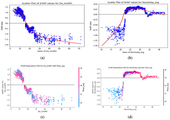 The SHAP dependence plots (a) between SHAP values and Da_minRH, with a fitted trend line (red line); (b) between SHAP values and Norainday_avg, with a fitted trend line (red line); (c) between SHAP values and Da_minRH, showing the interaction with Tmax_avg (color scale); (d) between SHAP values and Norainday_avg, showing the interaction with Tmax_avg (color scale). Da_minRH, daily minimum relative humidity; Noraindy_avg, average number of rainless days of fire season.