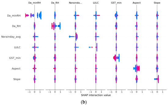 Figure 6a presents a heatmap analysis using SHAP values to explain the model, visualizing the importance and directional impact of different features across various samples. Comparing Figure 4a and Figure 6a, the importance of variables is represented by the absolute average of SHAP values across all available points, yet the significance of these variables can vary by region and time [58]. Figure 6b indicates that the Norainday_avg, SSH, Da_maxwind, Da_Tmax, Tmin_avg, and Aspect have a positive impact on the occurrence frequency. The association between Tmax_avg, Da_EVP, Dis_railway, GST_avg, Da_Tave, RH0_avg, and the frequency of wildfires demonstrates a more nonlinear pattern. The non-linear relationship between wildfire occurrence and predictive factors is dominated by other variables [40]. The SHAP interaction plot further demonstrates the contribution of interactions between several key features to the model output (Figure 6b). The vertical axis displays the primary features, while the horizontal axis shows the SHAP interaction values. The interactions between each feature and other features are illustrated in a scatter plot format. The scatter points transition from blue to red, indicating the change in feature values from low to high. For instance, in the interaction between Da_minRH and GST_min, as the GST_min values transition from low (blue) to high (red), the SHAP interaction values shift significantly. This indicates that higher GST_min values (red) correspond to higher SHAP interaction values, suggesting that the combination of these two features substantially contributes to the wildfire prediction model. In summary, there are significant differences in the impact of interactions between different features on forest wildfire occurrence. Specifically, under conditions of low humidity or prolonged periods without rain, the influence of other factors on wildfires becomes more pronounced.