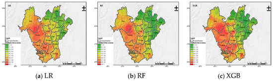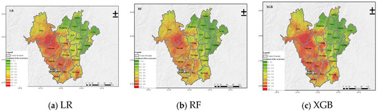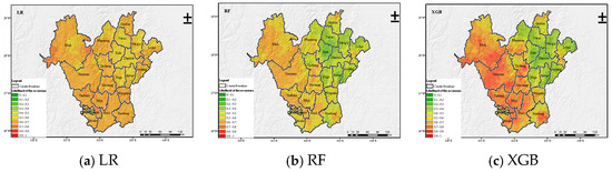 Fire-occurrence probability: analysis using LR, RF, and XGB based on local factors.